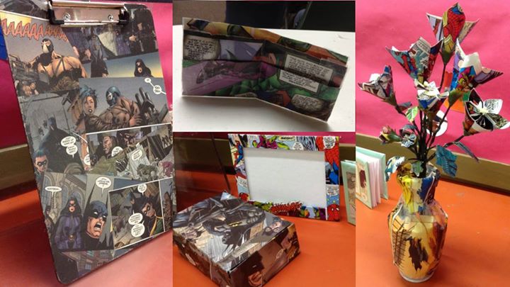 If you would like to decoupage (decorating objects with paper), please bring your own items (e.g. notebook, picture frame, shoe box) to cover in comics!