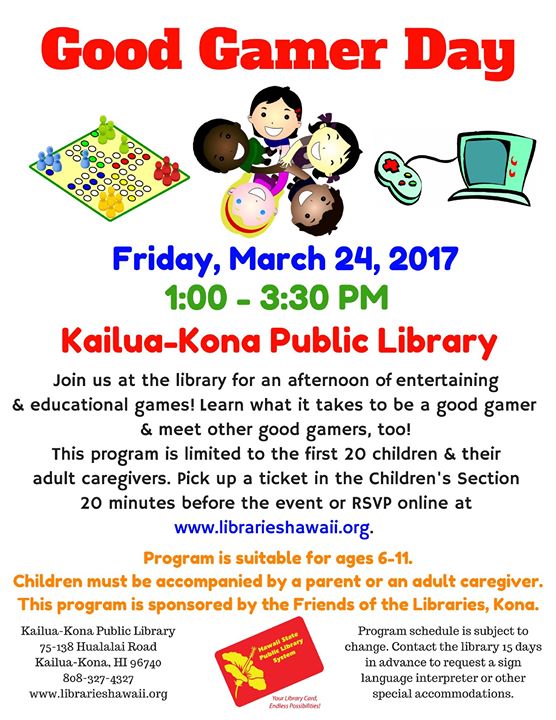 Join us at the library for an afternoon of entertaining and educational games! Learn what it takes to be a good gamer, and meet other good gamers, too!