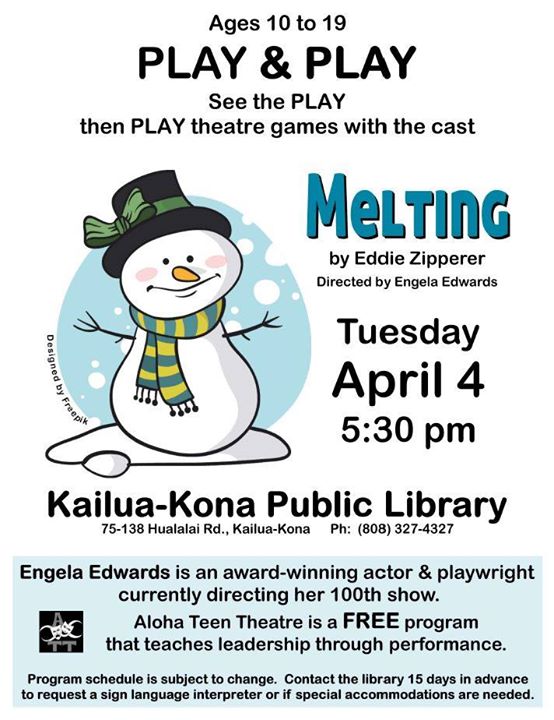 Kailua-Kona Public Library 75-138 Hualalai Rd, Kailua-KonaYoung people ages 10 to 19 years old are invited to participate in “Play & Play”, an opportunity to see a play, and then play theatre games with the cast! Engela Edwards, award-winning actor, playwright, and director of Aloha Teen Theatre will be directing the play “Melting” by Eddie Zipperer, performed by members of Aloha […]